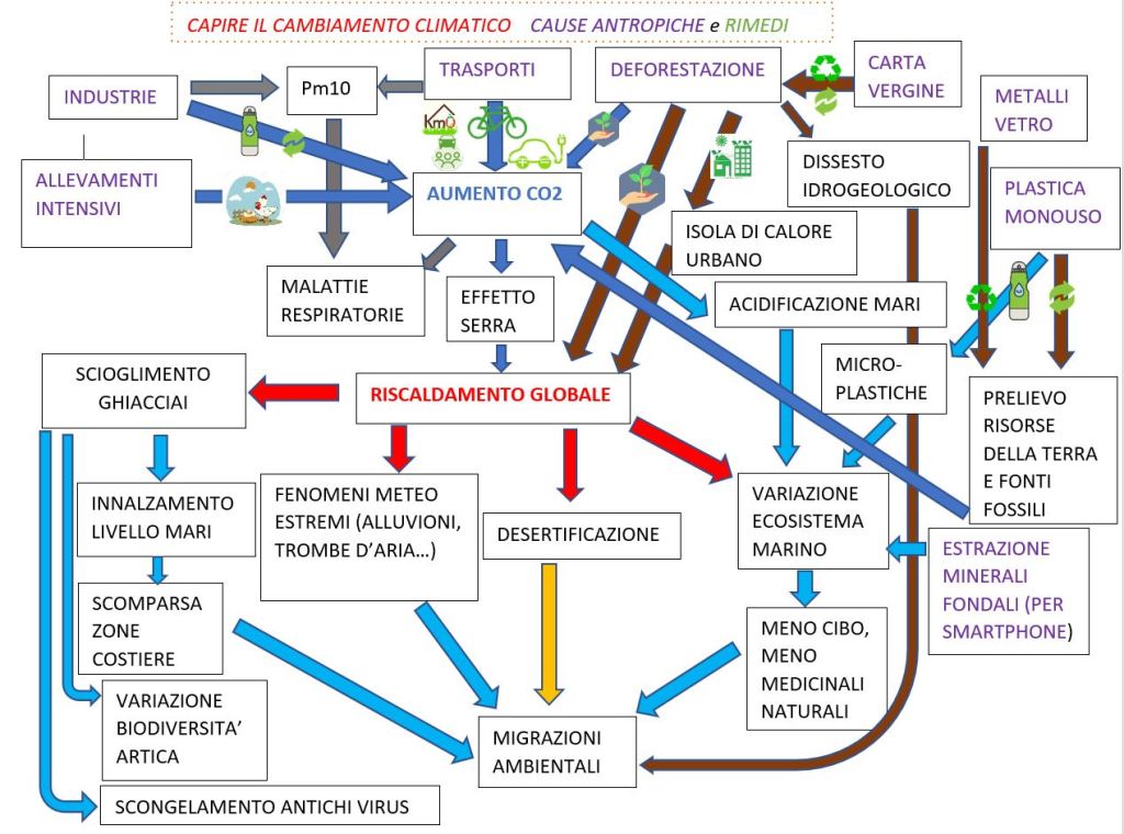 Cambiamento climatico, cosa abbiamo capito davvero? Possiamo farci qualcosa o no? La stragrande maggioranza degli scienziati ritiene che, accanto alle cause naturali, l’azione dell’uomo sia in questo momento determinante sul riscaldamento globale, a partire dalle emissioni climalteranti. Nella mappa concettuale che proponiamo, infatti, vediamo che l’uomo è attore in negativo (le cause antropiche in viola) ma può esserlo in positivo, ponendo al più presto un rimedio a tali relazioni causali (le icone sulle frecce). Gli scienziati parlano di pochi anni rimasti per porvi rimedio: non è una buona notizia, ma.. siamo ancora in tempo! In questa mappa concettuale abbiamo provato a mettere insieme le parole chiave, le cause, i fenomeni, le responsabilità umane, i possibili rimedi. Il progetto “Verso la differenziata..e oltre!” lancia questa iniziativa di conoscenza proprio oggi, 18 novembre 2019, perché inizia oggi la Settimana Europea della Riduzione dei Rifiuti, il cui focus è “Educazione e Comunicazione sui Rifiuti” (di cui vi avevamo parlato qui ). Ci piacerebbe capire in che modo c’entrano i rifiuti col cambiamento climatico, in che modo c’entrano le nostre abitudini quotidiane, i nostri stili di vita, le scelte dei nostri governanti.Abbiamo pensato di partire dalla sintesi, attraverso appunto questa mappa di concetti e relazioni, per lanciare un appello all’approfondimento di queste tematiche.